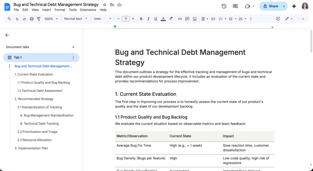 Just today I used Gemini to create a bug and technical debt strategy. The prompt I entered stated: “I need to create a strategy for how we track and manage our bugs and technical debt. It needs to include an evaluation of the current state of our product/backlog as well as a recommendation for how we improve the process.”
