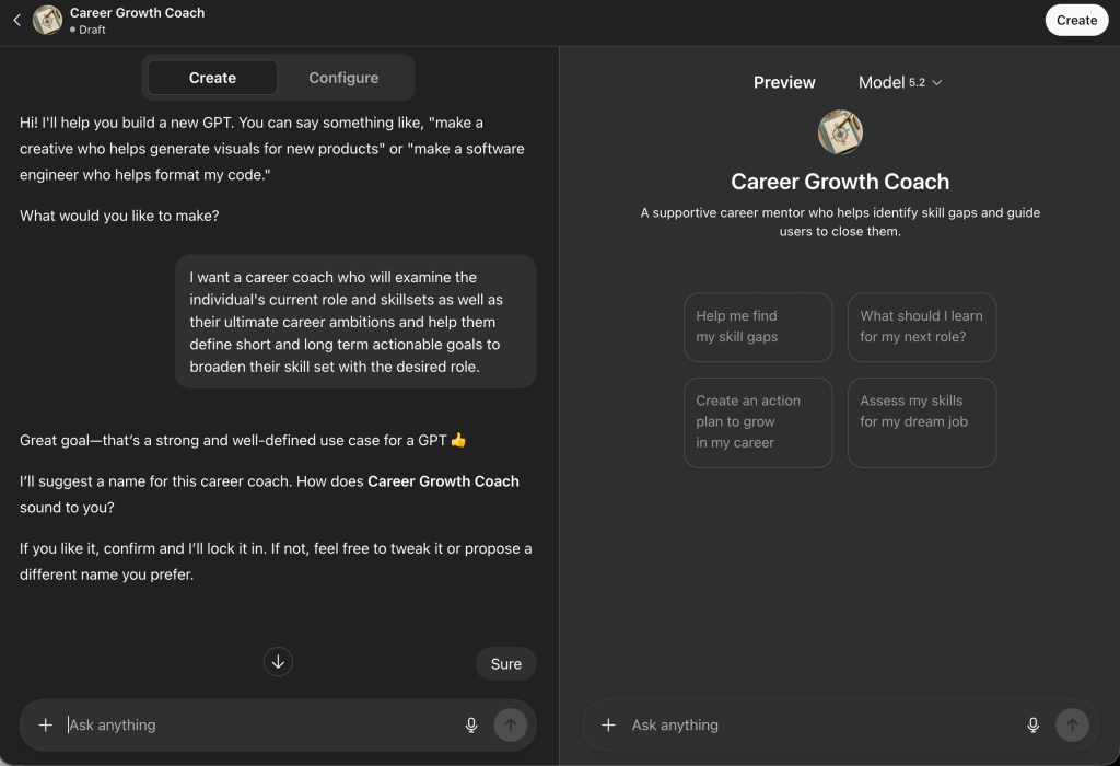 Then you can prompt the Agent to create a custom version of ChatGPT to engage with your engineers and help them develop concrete goals to serve their career ambitions.