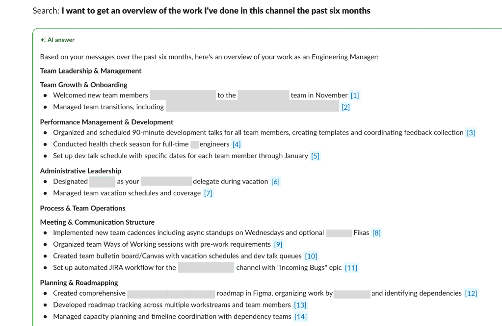 I was able to prompt Slack to get an overview of the work that had happened in workstream and team channels during a specified time period.